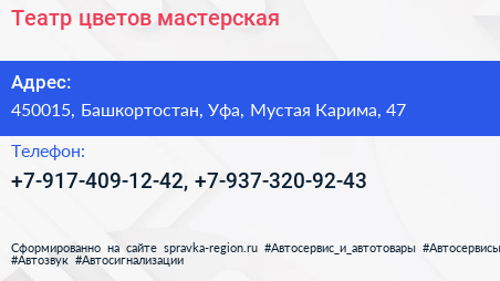 Театр цветов, мастерская по адресу 450015, Башкортостан, Уфа, Мустая Карима, 47 в дальнейшем Организация, размещена в следующих категориях: