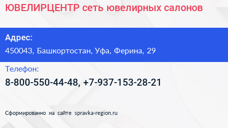 ЮВЕЛИРЦЕНТР, сеть ювелирных салонов по адресу 450043, Башкортостан, Уфа, Ферина, 29 в дальнейшем Организация, размещена в следующих категориях: