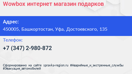 Wowbox, интернет-магазин подарков по адресу 450005, Башкортостан, Уфа, Достоевского, 135 в дальнейшем Организация, размещена в следующих категориях: