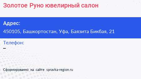 Золотое Руно, ювелирный салон по адресу 450105, Башкортостан, Уфа, Баязита Бикбая, 21 в дальнейшем Организация, размещена в следующих категориях: