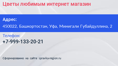 Цветы любимым, интернет-магазин по адресу 450022, Башкортостан, Уфа, Минигали Губайдуллина, 2 в дальнейшем Организация, размещена в следующих категориях: