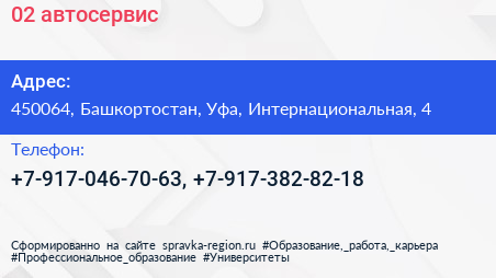 02, автосервис по адресу 450064, Башкортостан, Уфа, Интернациональная, 4 в дальнейшем Организация, размещена в следующих категориях: