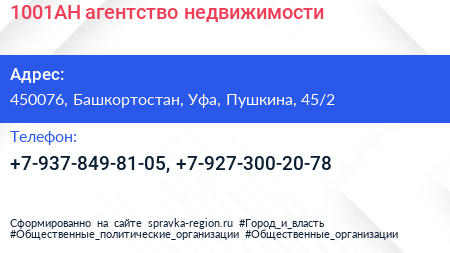 1001АН, агентство недвижимости по адресу 450076, Башкортостан, Уфа, Пушкина, 45/2 в дальнейшем Организация, размещена в следующих категориях: