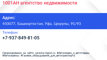 1001АН, агентство недвижимости по адресу 450077, Башкортостан, Уфа, Цюрупы, 91/93 в дальнейшем Организация, размещена в следующих категориях: