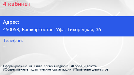 4 кабинет по адресу 450058, Башкортостан, Уфа, Тихорецкая, 36 в дальнейшем Организация, размещена в следующих категориях: