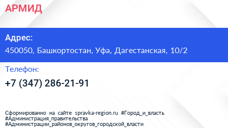 АРМИД по адресу 450050, Башкортостан, Уфа, Дагестанская, 10/2 в дальнейшем Организация, размещена в следующих категориях:
