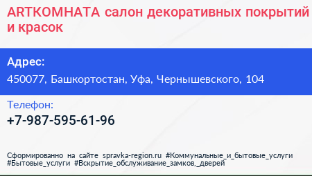 АRTКОМНАТА, салон декоративных покрытий и красок по адресу 450077, Башкортостан, Уфа, Чернышевского, 104 в дальнейшем Организация, размещена в следующих категориях: