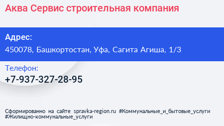 Аква-Сервис, строительная компания по адресу 450078, Башкортостан, Уфа, Сагита Агиша, 1/3 в дальнейшем Организация, размещена в следующих категориях: