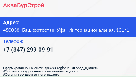 АкваБурСтрой по адресу 450038, Башкортостан, Уфа, Интернациональная, 131/1 в дальнейшем Организация, размещена в следующих категориях: