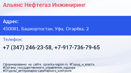 Альянс Нефтегаз Инжиниринг по адресу 450081, Башкортостан, Уфа, Огарёва, 2 в дальнейшем Организация, размещена в следующих категориях: