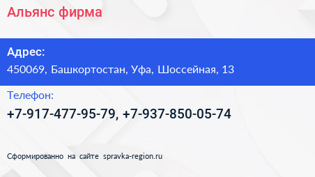 Альянс, фирма по адресу 450069, Башкортостан, Уфа, Шоссейная, 13 в дальнейшем Организация, размещена в следующих категориях: