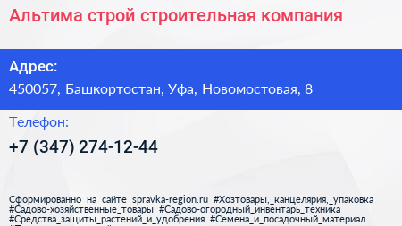 Альтима строй, строительная компания по адресу 450057, Башкортостан, Уфа, Новомостовая, 8 в дальнейшем Организация, размещена в следующих категориях: