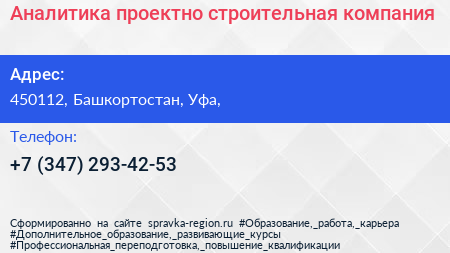 Аналитика, проектно-строительная компания по адресу 450112, Башкортостан, Уфа, в дальнейшем Организация, размещена в следующих категориях: