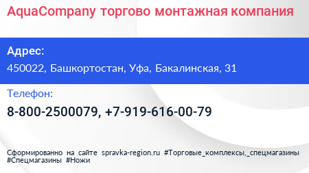 AquaCompany, торгово-монтажная компания по адресу 450022, Башкортостан, Уфа, Бакалинская, 31 в дальнейшем Организация, размещена в следующих категориях:
