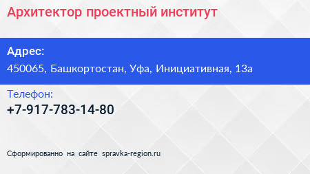Архитектор, проектный институт по адресу 450065, Башкортостан, Уфа, Инициативная, 13а в дальнейшем Организация, размещена в следующих категориях: