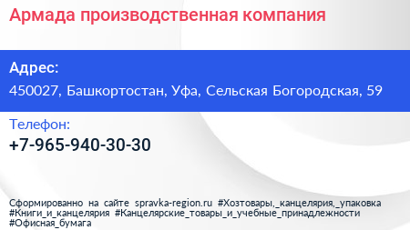 Армада, производственная компания по адресу 450027, Башкортостан, Уфа, Сельская Богородская, 59 в дальнейшем Организация, размещена в следующих категориях: