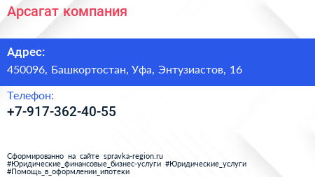 Арсагат, компания по адресу 450096, Башкортостан, Уфа, Энтузиастов, 16 в дальнейшем Организация, размещена в следующих категориях: