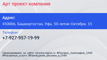 Арт проект, компания по адресу 450006, Башкортостан, Уфа, 50-летия Октября, 15 в дальнейшем Организация, размещена в следующих категориях: