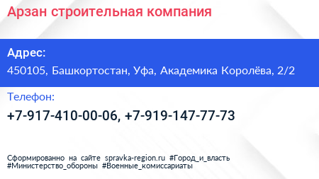 Арзан, строительная компания по адресу 450105, Башкортостан, Уфа, Академика Королёва, 2/2 в дальнейшем Организация, размещена в следующих категориях: