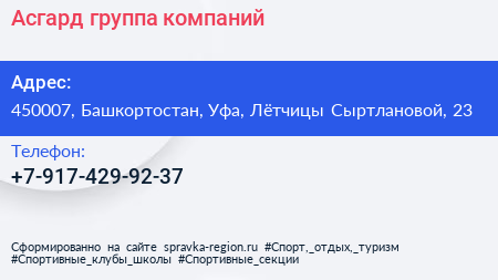 Асгард, группа компаний по адресу 450007, Башкортостан, Уфа, Лётчицы Сыртлановой, 23 в дальнейшем Организация, размещена в следующих категориях: