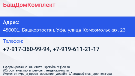 БашДомКомплект по адресу 450001, Башкортостан, Уфа, улица Комсомольская, 23 в дальнейшем Организация, размещена в следующих категориях:
