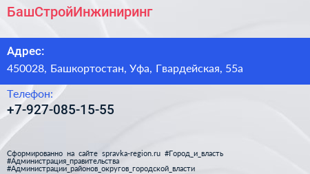 БашСтройИнжиниринг по адресу 450028, Башкортостан, Уфа, Гвардейская, 55а в дальнейшем Организация, размещена в следующих категориях: