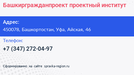 Башкиргражданпроект, проектный институт по адресу 450078, Башкортостан, Уфа, Айская, 46 в дальнейшем Организация, размещена в следующих категориях: