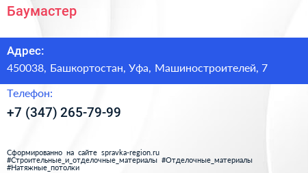 Баумастер по адресу 450038, Башкортостан, Уфа, Машиностроителей, 7 в дальнейшем Организация, размещена в следующих категориях: