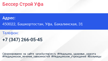 Бессер-Строй Уфа по адресу 450022, Башкортостан, Уфа, Бакалинская, 31 в дальнейшем Организация, размещена в следующих категориях: