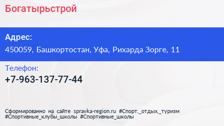 Богатырьстрой по адресу 450059, Башкортостан, Уфа, Рихарда Зорге, 11 в дальнейшем Организация, размещена в следующих категориях:
