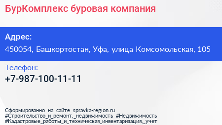 БурКомплекс, буровая компания по адресу 450054, Башкортостан, Уфа, улица Комсомольская, 105 в дальнейшем Организация, размещена в следующих категориях: