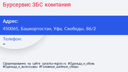 Бурсервис-ЗБС, компания по адресу 450065, Башкортостан, Уфа, Свободы, 86/2 в дальнейшем Организация, размещена в следующих категориях:
