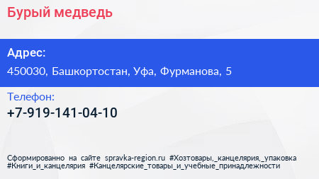 Бурый медведь по адресу 450030, Башкортостан, Уфа, Фурманова, 5 в дальнейшем Организация, размещена в следующих категориях: