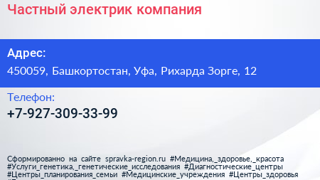 Частный электрик, компания по адресу 450059, Башкортостан, Уфа, Рихарда Зорге, 12 в дальнейшем Организация, размещена в следующих категориях: