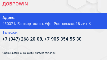 ДОБРОWIN по адресу 450071, Башкортостан, Уфа, Ростовская, 18 лит К в дальнейшем Организация, размещена в следующих категориях: