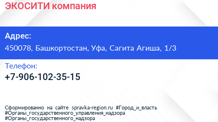 ЭКОСИТИ, компания по адресу 450078, Башкортостан, Уфа, Сагита Агиша, 1/3 в дальнейшем Организация, размещена в следующих категориях:
