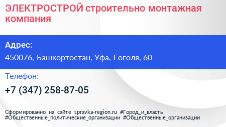 ЭЛЕКТРОСТРОЙ, строительно-монтажная компания по адресу 450076, Башкортостан, Уфа, Гоголя, 60 в дальнейшем Организация, размещена в следующих категориях: