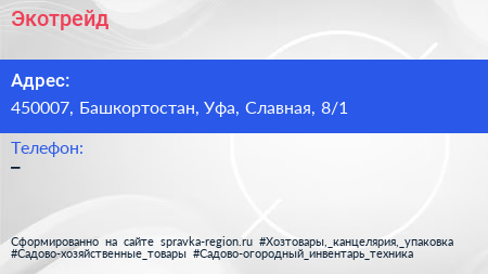 Экотрейд по адресу 450007, Башкортостан, Уфа, Славная, 8/1 в дальнейшем Организация, размещена в следующих категориях: