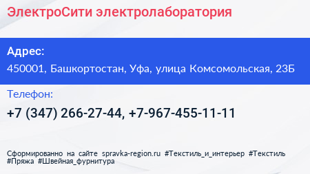 ЭлектроСити, электролаборатория по адресу 450001, Башкортостан, Уфа, улица Комсомольская, 23Б в дальнейшем Организация, размещена в следующих категориях: