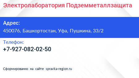 Электролаборатория Подземметаллзащита по адресу 450076, Башкортостан, Уфа, Пушкина, 33/2 в дальнейшем Организация, размещена в следующих категориях: