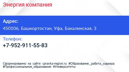 Энергия, компания по адресу 450106, Башкортостан, Уфа, Бакалинская, 3 в дальнейшем Организация, размещена в следующих категориях: