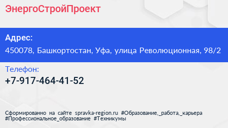 ЭнергоСтройПроект по адресу 450078, Башкортостан, Уфа, улица Революционная, 98/2 в дальнейшем Организация, размещена в следующих категориях: