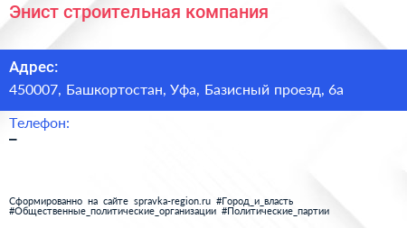 Энист, строительная компания по адресу 450007, Башкортостан, Уфа, Базисный проезд, 6а в дальнейшем Организация, размещена в следующих категориях: