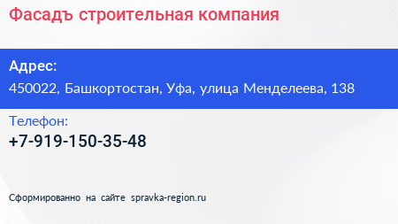 Фасадъ, строительная компания по адресу 450022, Башкортостан, Уфа, улица Менделеева, 138 в дальнейшем Организация, размещена в следующих категориях: