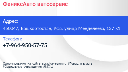 ФениксАвто, автосервис по адресу 450047, Башкортостан, Уфа, улица Менделеева, 137 к1 в дальнейшем Организация, размещена в следующих категориях: