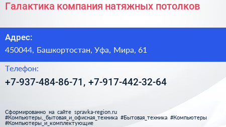 Галактика, компания натяжных потолков по адресу 450044, Башкортостан, Уфа, Мира, 61 в дальнейшем Организация, размещена в следующих категориях: