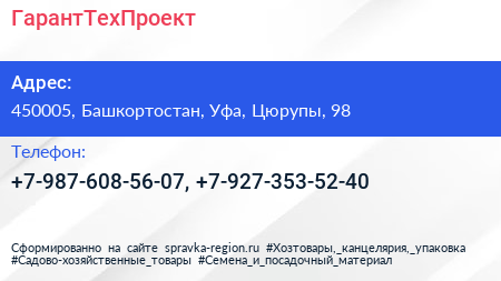 ГарантТехПроект по адресу 450005, Башкортостан, Уфа, Цюрупы, 98 в дальнейшем Организация, размещена в следующих категориях: