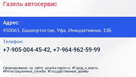 Газель, автосервис по адресу 450065, Башкортостан, Уфа, Инициативная, 13Б в дальнейшем Организация, размещена в следующих категориях: