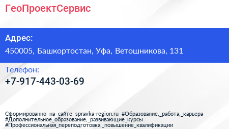 ГеоПроектСервис по адресу 450005, Башкортостан, Уфа, Ветошникова, 131 в дальнейшем Организация, размещена в следующих категориях: