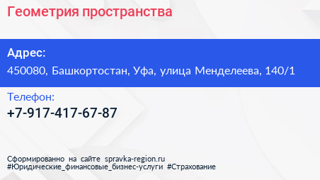 Геометрия пространства+ по адресу 450080, Башкортостан, Уфа, улица Менделеева, 140/1 в дальнейшем Организация, размещена в следующих категориях: